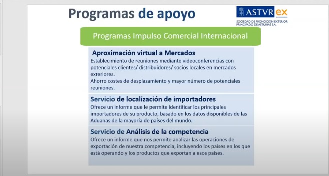 Otro de los puntos fuertes de los servicios de Asturex que se presentaron en la sesión fueron sus programas de apoyo a empresas. Estos programas se dividen en 4 grandes bloques como son los programas para los primeros pasos  a dar,  el Impulso Comercial Internacional, el Marketing Digital y el Comercio Electrónico y de Becas, Recursos Humanos y Formación. La atención que se ofrece incluye desde el estudio de las empresas para detectar potencialidades y debilidades para exportar, el acompañamiento en los primeros pasos de la internacionalización, la formación en la tramitación burocrática hasta la facilitación de listados de importadores, el análisis de la competencia y la puesta en contacto con Marketplaces internacionales, entre muchos otros servicios.