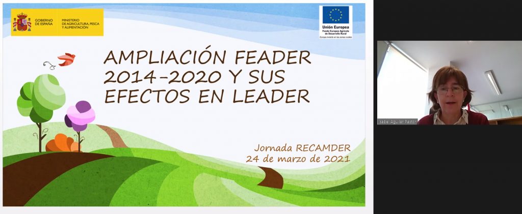 Ponencia 'Ampliación de FEADER 2014/2020 en los años 2021 y 2022 y sus efectos en Leader', de Isabel Aguilar, subdirectora general de Programas y Coordinación de la Dirección General de Desarrollo Rural, Innovación y Formación del Ministerio de Agricultura, Pesca y Alimentación. Ver aquí.
