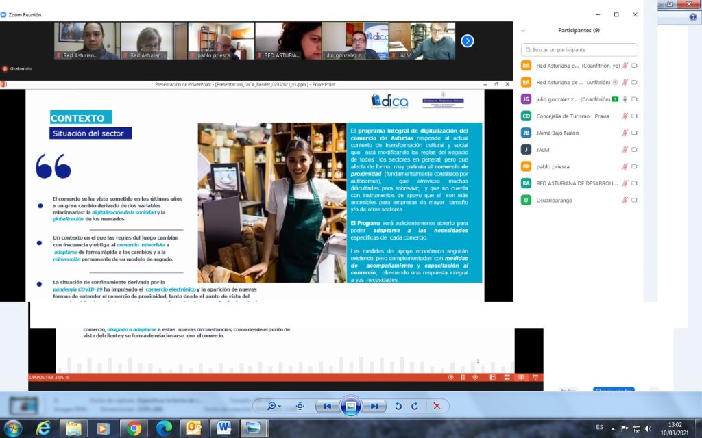 Esta iniciativa cuenta con el asesoramiento de la Fundación Centro Tecnológico de la Información y la Comunicación (CTIC) y pretende lograr la digitalización masiva del comercio de proximidad mediante una intervención integral que, partiendo de un diagnóstico de la situación actual del comercio, contempla acciones de formación, orientación y acompañamiento, así como el desarrollo de soluciones innovadoras adaptadas al perfil de cada establecimiento. Desde la Dirección General de Comercio, Emprendedores y Economía Social ha solicitado el apoyo de los once Grupos de Desarrollo Rural para la puesta en marcha de un proyecto que “no pretende sustituir ni reemplazar la esencia del pequeño comercio, su cercanía presencial y personal con el cliente, sino que viene a incorporar la innovación también como garantía de futuro”. Según explico Julio González Zapico, la situación de confinamiento derivada de la pandemia COVID-19 ha impulsado el comercio electrónico y la aparición de nuevas formas de entender el comercio de proximidad que necesariamente también “debe adaptarse a una ciudadanía que demanda una forma diferente de consumir”.