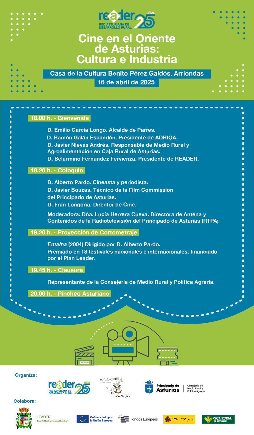 Arrancan los actos conmemorativos del 25 aniversario de la Red Asturiana de Desarrollo Rural (Reader) con la primera de las once jornadas temáticas que acogerán cada uno de los Grupos de Desarrollo Rural. La Asociación para el Desarrollo Integral del Oriente de Asturias organiza un encuentro dedicado al cine en el oriente de la región.