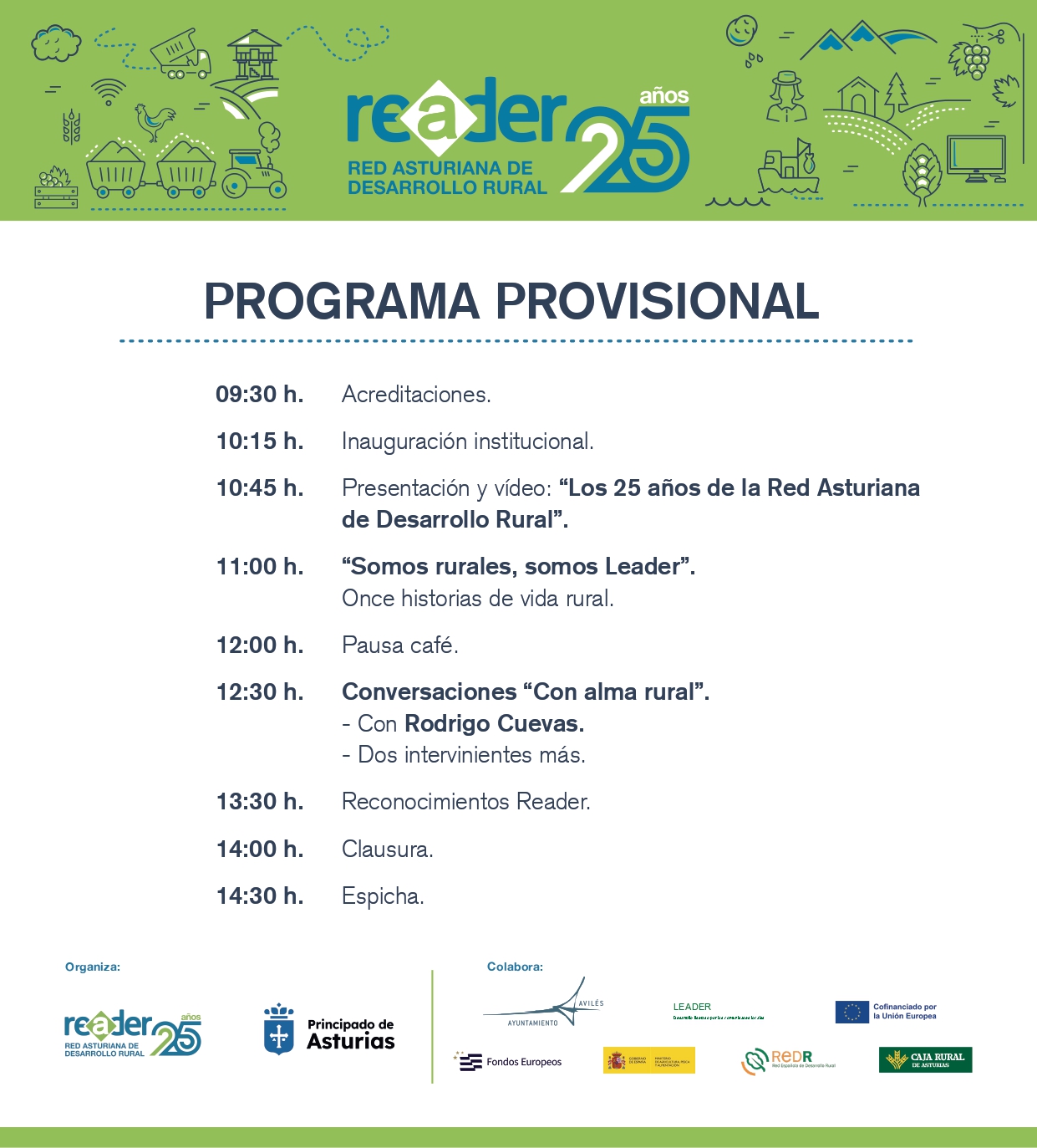 Avanzamos el programa provisional para el gran acto central del 26 de junio con motivo del 25 aniversario de la Red Asturiana de Desarrollo Rural el jueves 26 de junio desde las 09.30 horas en el Centro Niemeyer de Avilés. El evento contará con la presencia del presidente del Principado de Asturias, Adrián Barbón, mientras que el agitador folclórico Rodrigo Cuevas ya ha confirmado su participación para una conversación con alma rural: