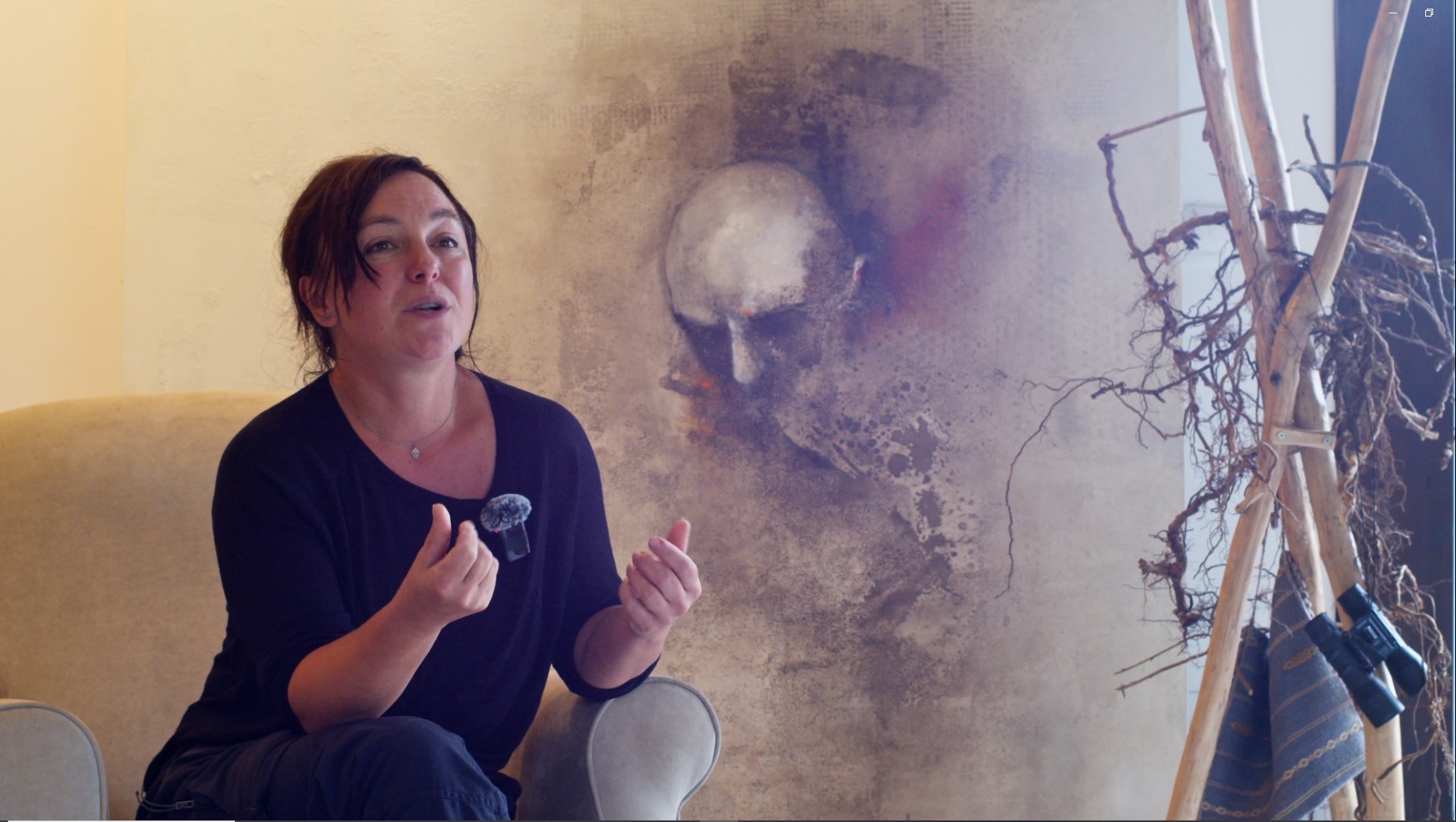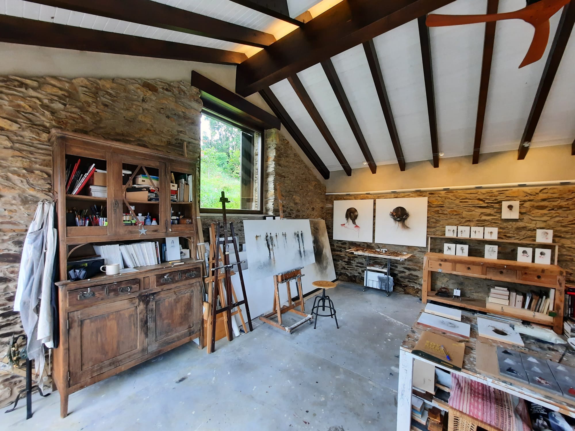 Tanto ella como su marido comparten el amor por Asturias, a donde se escapaban cada vez que podían, aprovechando también que ambos tienen familia aquí. Refiere que tiene la sensación de “vivir en un cuento de hadas por el hecho de vivir aquí por la tranquilidad, el paisaje en sí, muy inspirador”, algo que también ha enriquecido su propia pintura, a la que le incorpora elementos de la naturaleza, la misma que se cuela por las grietas del antiguo pajar rehabilitado que ha convertido en su estudio.